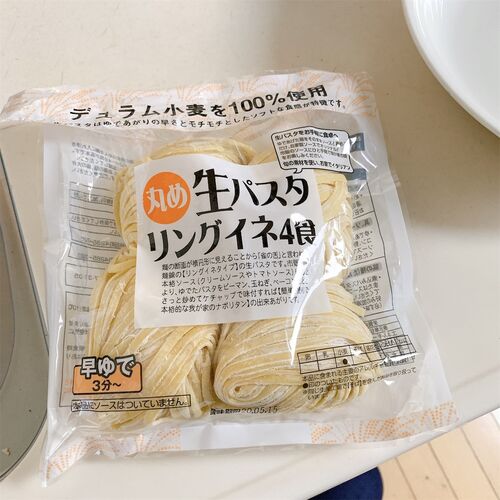 肉のハナマサで売っている生パスタでしょう。 100g ✕ 4玉入りで 300円くらいだったかと。 同じくハナマサのジェノベーゼソースでしょう。 300円くらいだったかと。 大盛りいきたいでしょう、1.5玉で 150g。 多めの水を沸騰させて、塩入れて、茹でるでしょう…